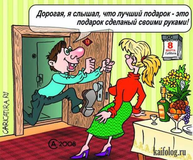 - Моя тихоня месяц тому назад заявила мне, что 8 марта будет планировать сама и это будет сюрприз. Ладно, думаю я, баба с возу - кобыле легче. Честно сказать, я заранее приготовил ей подарок, запаковал его, все дела. И вот в прошлую среду прихожу домой, а там моя, светится, как обожравшийся фосфора чеширский кот. "Милый, - говорит, - я приготовила для себя подарок! Мы едем в Таиланд!" Спрашиваю её, когда едем-то? "Завтра утром самолёт из Новосибирска! За путёвки перед отлётом в Новосибирске рассчитаемся!" - сообщает мне эта ненормальная! А ничего, что у нас денег нет? Что у меня работа? Что у нас ремонт дома недоделанный? Что, нерюнгри поперёк, я маме обещал с крыши снег скинуть на выходных?!